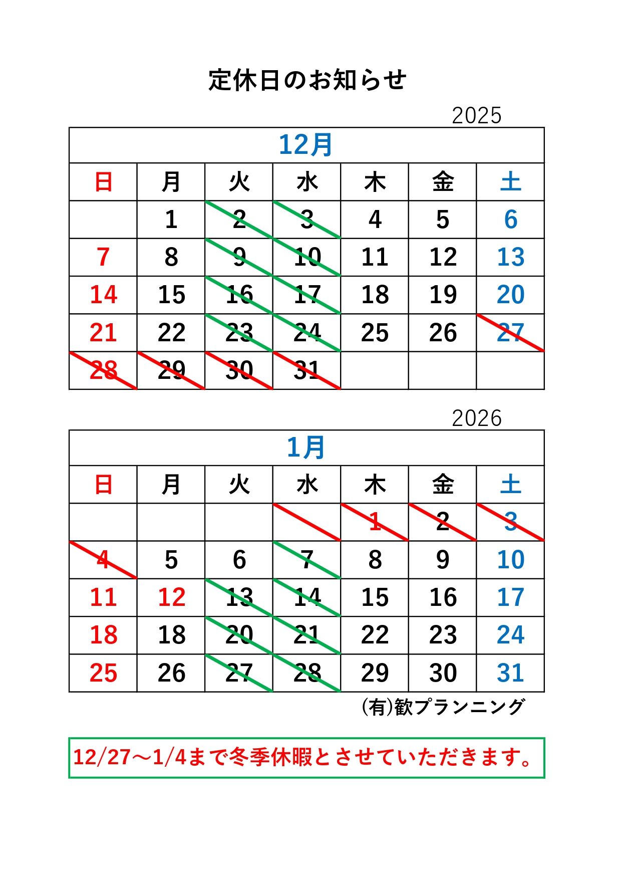 12/27(土)~1/4(日)は冬季休暇とさせていただきます。